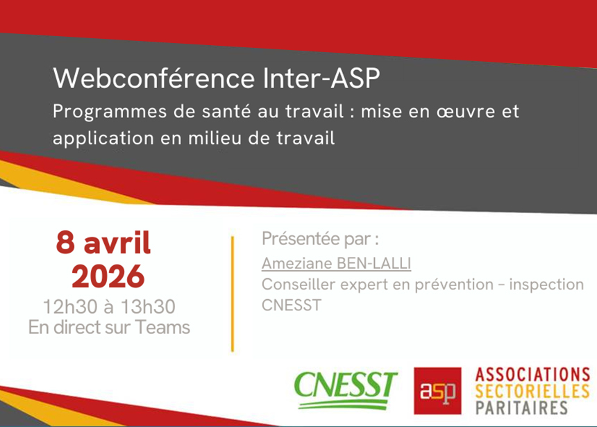 Destinée au milieu de travail (employeurs et travailleurs), cette présentation met en valeur des exemples concrets sur l’application de certains PS dans un programme de prévention ou un plan d’action à travers des mises en situation. Les participants découvriront des approches simplifiées et des outils pratiques pour renforcer la santé au travail dans leurs milieux respectifs. Les échanges porteront sur les rôles complémentaires des employeurs et des travailleurs dans la mise en œuvre de ces programmes adaptés aux réalités de chaque milieu.