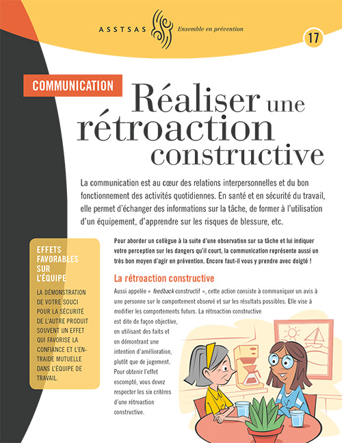 La communication est au cœur des relations interpersonnelles et du bon fonctionnement des activités quotidiennes. En santé et en sécurité du travail, elle permet d’échanger des informations sur la tâche, de former à l’utilisation d’un équipement, d’apprendre sur les risques de blessure, etc. Cette fiche présente six critères pour réaliser une rétroaction constructive auprès de votre collègue.